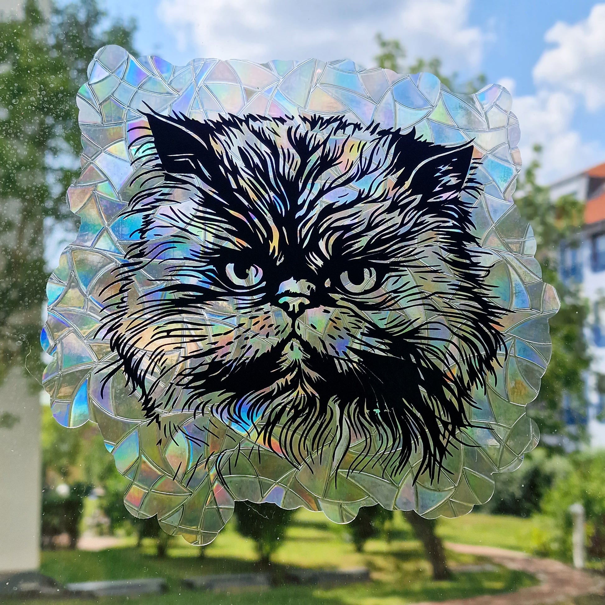 Step 6: Enjoy the enchanting play of colors and the cute cat shape that now decorates your window. Admire the reflections of the rainbow that bring a cheerful atmosphere to the room.