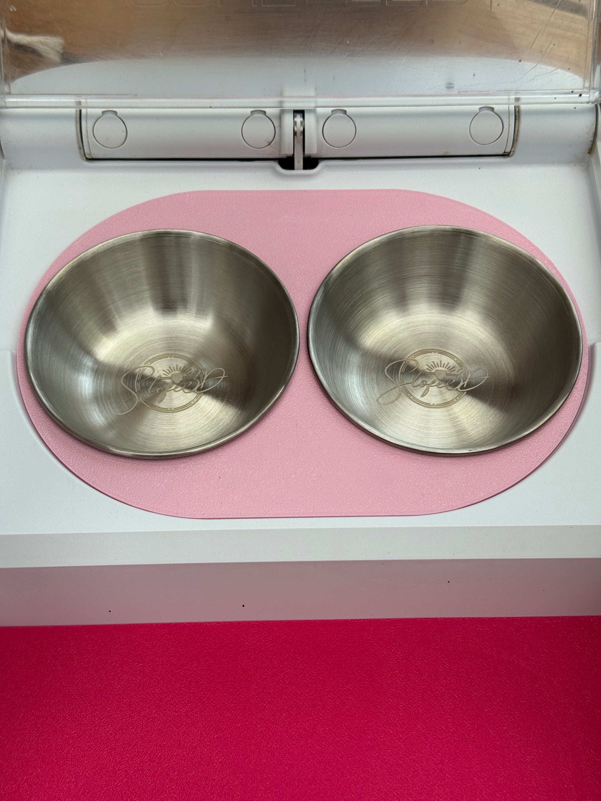 Durch unseren Adapter sitzen die runden Edelstahlnäpfe sicher im SureFeed® Futterautomat.