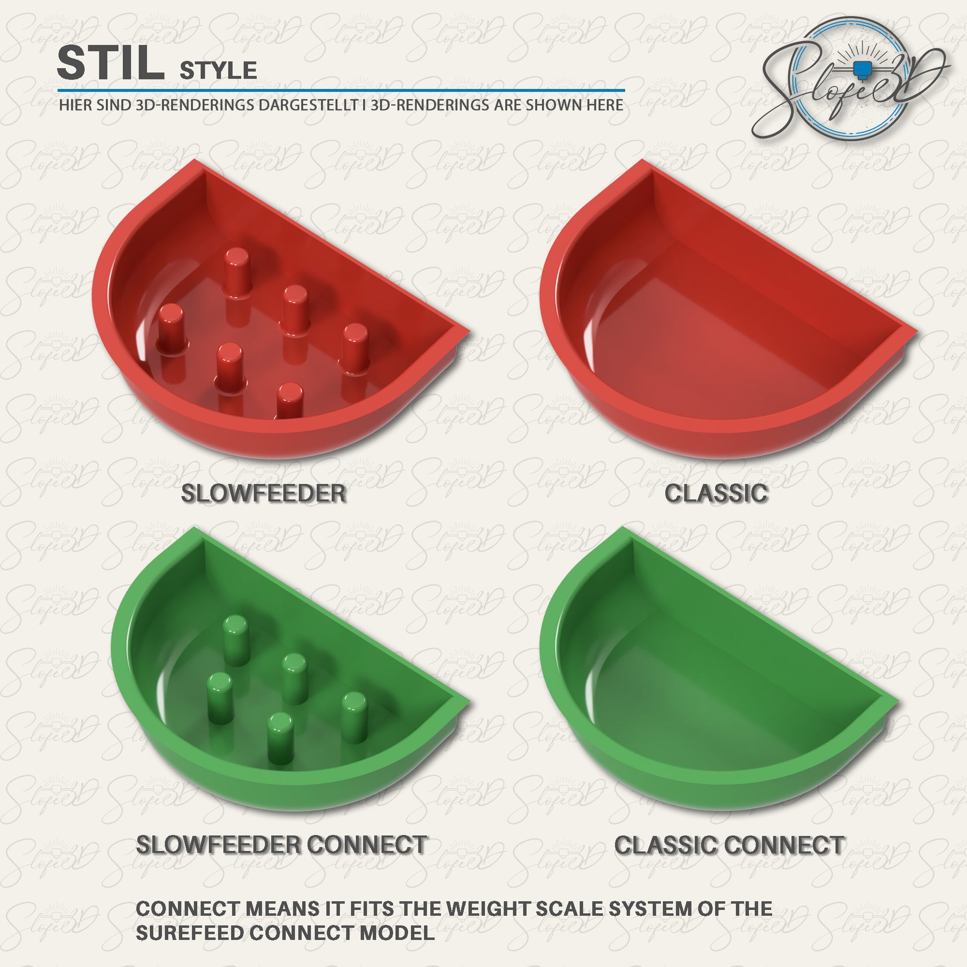 Die (Slow Feed) Halbschale passt für alle SureFeed® Automaten, außer den SureFeed® Connect. Für den SureFeed® Connect bitte die Halbschalen mit dem Vermerk "connect" auswählen, diese sind NUR für den SureFeed® Connect und sind so gestaltet, dass sie auf der Waage perfekt sitzen.